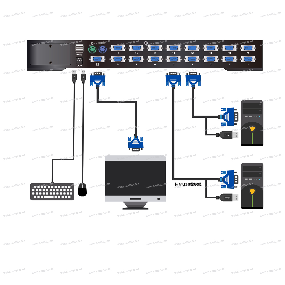 16端口USB机架式KVM多电脑切换器是一台可允许管理人员从一组USB键盘、鼠标或者一组PS2键盘、鼠标及控制端访问16 VGA电脑的多功能设备。支持两层级占口级联可从单一控制端管理多达256台电脑;