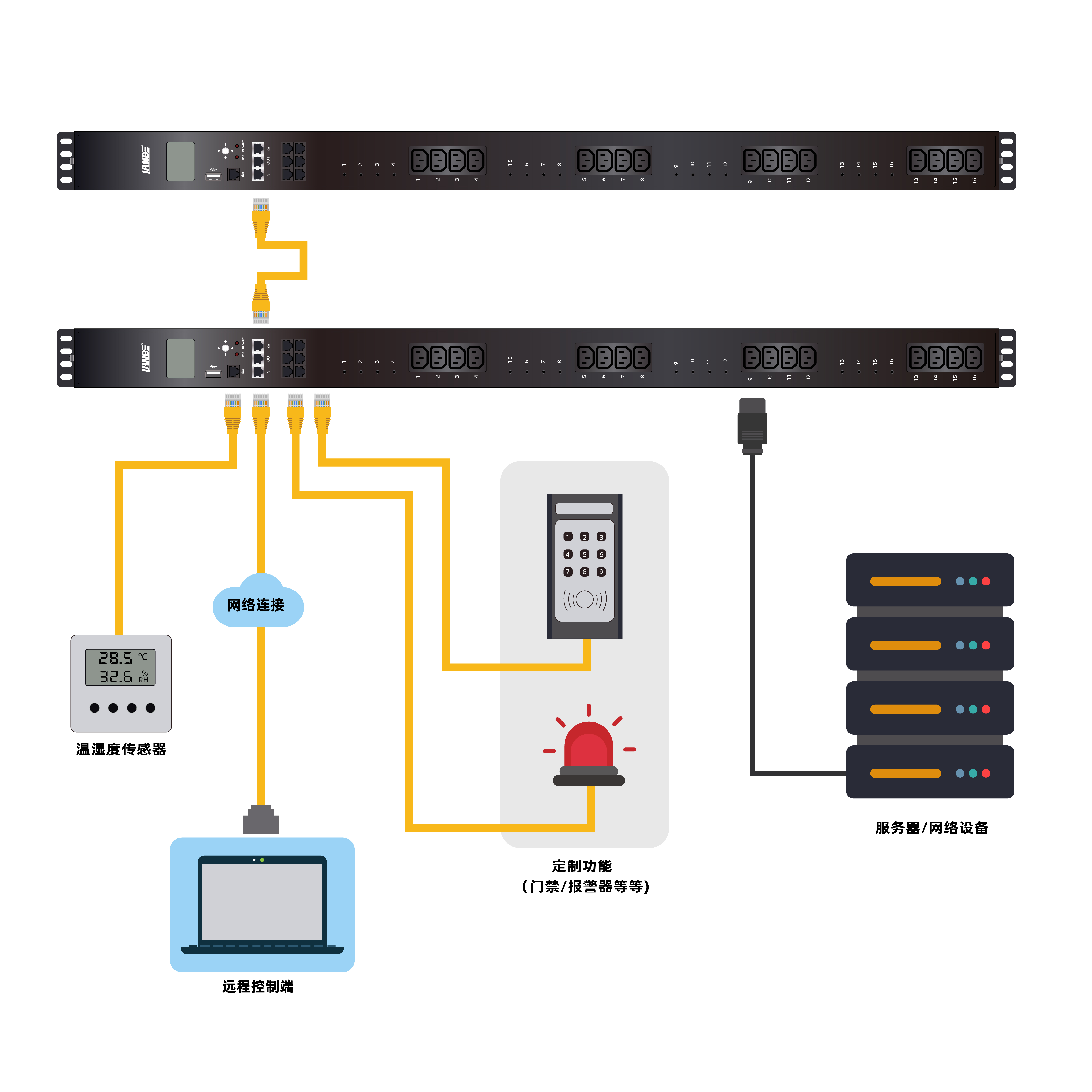 这些电源分配器可安全、集中且智能地管理服务器机房、监控、商超、交通、路桥等应用场景的电源(开、关、循环) 并可通过感应器监控电源设备的使用状况。