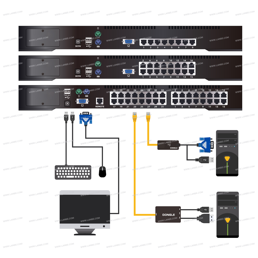提供四种便捷方式,可切换安装架构中的电脑: (1)使用切换器前面板的连接端口选择按键;(2)从键盘输入热键组合;(3)从屏幕显示(OSD)的选单上选择。自动扫描功能提供自动扫描,并逐一监控安装架构中的电脑。(4)通过扩展的IP模块的网络端口进行远程的网络控制操作连在KVM上面的电脑。